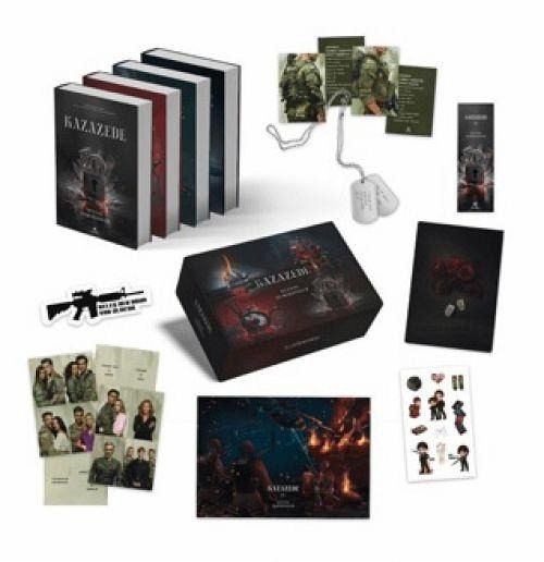Kazazede 1 ciltli poster, ayrac, 2 adet tim karti Kazazede 2 ciltli poster, ayrac, 2 adet tim karti Kazazede 3 ciltli poster, ayrac, 3 adet tim karti Kazazede 4 ciltli poster, ayrac, 2 adet tim karti Defter Özel kesim ayrac Sticker set 2 adet 4lü kart Künye kolye
