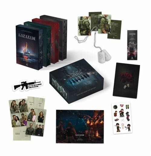 Kazazede 1 ciltli kenar boyali poster, ayrac, 2 adet tim karti Kazazede 2 ciltli kenar boyali poster, ayrac, 2 adet tim karti Kazazede 3 ciltli kenar boyali poster, ayrac, 3 adet tim karti Kazazede 4 ciltli kenar boyali poster, ayrac, 2 adet tim karti Defter Özel kesim ayrac Sticker set 2 adet 4lü kart Künye kolye
