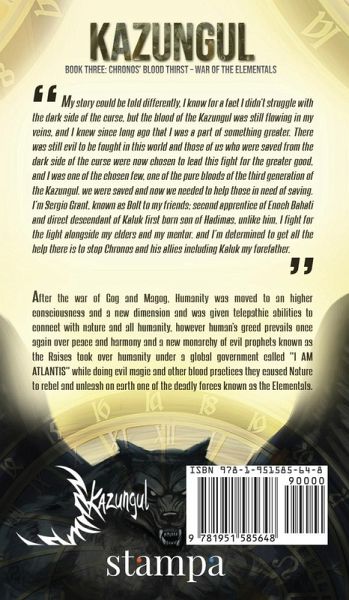 My story could be told differently, I know for a fact I didn't struggle with the dark side of the curse, but the blood of the Kazungul was still flowing in my veins, and I knew since long ago that I was a part of something greater. There was still evil to be fought in this world and those of us who were saved from the dark side of the curse were now chosen to lead this fight for the greater good, and I was one of the chosen few, one of the pure bloods of the third generation of the Kazungul. we were saved and now we needed to help those in need of saving. I'm Sergio Grant, known as Bolt to my friends; second apprentice of Enoch Bahati and direct descendant of Kaluk first born son of Hadimas, unlike him, I fight for the light alongside my elders and my mentor. and I'm determined to get all the help there is to stop Chronos and his allies including Kaluk my forefather.