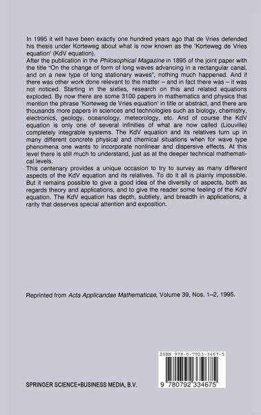 Preface; E.M. de Jager. Part I: Invited Plenary Lectures. Integrability, Computation and Applications; M.J. Ablowitz, S. Chakravarty, B. M. Herbst. Applications of KdV; D.G. Crighton. Instructive History of the Quantum Inverse Scattering Method; L. Faddeev. Optical Solitons in Communications: From Integrability to Controllability; A. Hasegawa. Korteweg, de Vries, and Dutch Science at the Turn of the Century; A.J. Kox. Algebraic-Geometrical Methods in the Theory of Integrable Equations and Their Perturbations; I. Krichever. An ODE to PDE: Glories of the KdV Equation. An Appreciation of the Equation on its 100th Birthday! M.D. Kruskal. The Discrete Korteweg-de Vries Equation; F. Nijhoff, H. Capel. Coherent Structure Visiometrics: From the Soliton to HEC; N.J. Zabusky. Part II: Invited Contributions. The KPI Equation with Unconstrained Initial Data; M. Boiti, F. Pempinelli, A. Pogrebkov. Solitons and the Korteweg-de Vries Equation: Integrable Systems in 1834-1995; R.K. Bullough, P.J. Caudrey. Integrable Nonlinear Evolution Equations and Dynamical Systems in Multidimensions; F. Calgero. Symmetry Reductions and Exact Solutions of Shallow Water Wave Equations; P.A. Clarkson, E.L. Mansfield. A KdV Equation in 2+1 dimensions: Painlevé Analysis, Solutions and Similarity Reductions; P.G. Estévez, S.B. Leble. The Korteweg-de Vries Equation and Beyond; A.S. Fokas. On the Background of Limit Pass for Korteweg-de Vries Equation as the Dispersion Vanishes; V.A. Galkin, V.V. Russkikh. On New Trace Formulae for Schrödinger Operators; F. Gesztesy, H. Holden. KdV Equations and Integrability Detectors; B. Grammaticos, V. Papageorgiou, A. Ramani. Generalized Self-Dual Yang-Mills Flows, Explicit Solutions and Reductions; C.-H. Gu. Symbolic Software for Soliton Theory; W. Hereman, W. Zhuang. Solitons of Curvature; B.G. Konopelchenko. The Reductive Perturbation Method and the Korteweg&endash;de Vries Hierarchy; R.A. Kraenkel, J.G. Pereira, M.A. Manna. Darboux Transformations for Higher-Rank Kadomtsev&endash;Petviashvili and Krichever&endash;Novikov Equations; G.A. Latham, E. Previato. Moment Problem of Hamburger, Hierarchies of Integrable Systems, and the Positivity of Tau-Functions; Y. Nakamura, Y. Kodama. New Features of Soliton Dynamics in 2+1 Dimensions; F. Pempinelli. Cnoidal Wave Trains and Solitary Waves in a Dissipation-Modified Korteweg&endash;de Vries Equation; A.Ye. Rednikov, M.G. Velarde, Yu.S. Ryazantsev, A.A. Nepomnyashchy, V.N. Kurdyumov. Recent Results on the Generalized Kadomtsev&endash;Petviashvili Equations; J.-C. Saut. An Explicit Expression for the Korteweg&endash;de Vries Hierarchy; R. Schimming. Evolving Solitons in Bubbly Flows; L. van Wijngaarden.