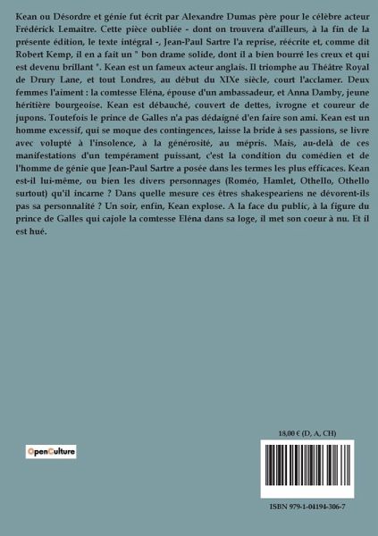 Kean ou Désordre et génie fut écrit par Alexandre Dumas père pour le célèbre acteur Frédérick Lemaitre. Cette pièce oubliée - dont on trouvera d'ailleurs, à la fin de la présente édition, le texte intégral -, Jean-Paul Sartre l'a reprise, réécrite et, comme dit Robert Kemp, il en a fait un " bon drame solide, dont il a bien bourré les creux et qui est devenu brillant ". Kean est un fameux acteur anglais. Il triomphe au Théâtre Royal de Drury Lane, et tout Londres, au début du XIXe siècle, court l'acclamer. Deux femmes l'aiment : la comtesse Eléna, épouse d'un ambassadeur, et Anna Damby, jeune héritière bourgeoise. Kean est débauché, couvert de dettes, ivrogne et coureur de jupons. Toutefois le prince de Galles n'a pas dédaigné d'en faire son ami. Kean est un homme excessif, qui se moque des contingences, laisse la bride à ses passions, se livre avec volupté à l'insolence, à la générosité, au mépris. Mais, au-delà de ces manifestations d'un tempérament puissant, c'est la condition du comédien et de l'homme de génie que Jean-Paul Sartre a posée dans les termes les plus efficaces. Kean est-il lui-même, ou bien les divers personnages (Roméo, Hamlet, Othello, Othello surtout) qu'il incarne ? Dans quelle mesure ces êtres shakespeariens ne dévorent-ils pas sa personnalité ? Un soir, enfin, Kean explose. A la face du public, à la figure du prince de Galles qui cajole la comtesse Eléna dans sa loge, il met son coeur à nu. Et il est hué.