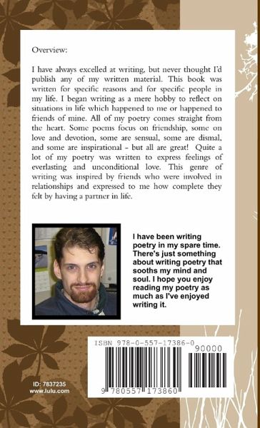 In this book, you will find poems dealing with a range of issues from life to death, from sadness to love, and from dismay to inspiration. Most of my poetry is catered around friendship and everlasting love. Some are playful and funny while others are dismal and depressing.