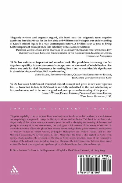 "Negative capability", the term John Keats used only once in a letter to his brothers, is a well-known but surprisingly unexplored concept in literary criticism and aesthetics. This book is the first book-length study of this central concept in seventy years. As well as clarifying the meaning of the term and giving an anatomy of its key components, the book gives a full account of the history of this idea. It traces the narrative of how the phrase first became known and gradually gained currency, and explores its primary sources in earlier writers, principally Shakespeare and William Hazlitt, and its chief Modernist successors, W. B. Yeats and T. S. Eliot. Meanwhile, the term is also applied to Keats's own poetry, which manifests the evolution of the idea in Keats's poetic practice. Many of the comparative readings of the relevant texts, including King Lear, illuminate the interconnections between these major writers. The book is an original and significant piece of scholarship on this celebrated concept.