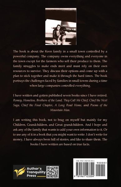 The book is about the Keen family in a small town controlled by a powerful company. The company owns everything and everyone in the town except for the farmers who sell their produce to them. The family struggles to make ends meet and must rely on their own resources to survive. They discuss their options and come up with a plan to stick together and make it through the hard times. The book portrays the challenges faced by families in small towns during a time when large companies controlled everything. I have written and gotten published seven books since I have retired. Romey, Homeless, Brothers of the Land, They Call Me Chief, Chief the Next Saga, Chief the Final Chapter, A Long Road Home, and Poems of the Mountain Man.I am writing this book, not to brag on myself but mainly for my Children, Grandchildren, and Great grandchildren. And I hope and ask any of the family that wants to add your own information to it. Or to use any of it in a book that you might want to write. I don't write for money, I have always been full of stories, and like to share them. The books I have written are based on true facts.