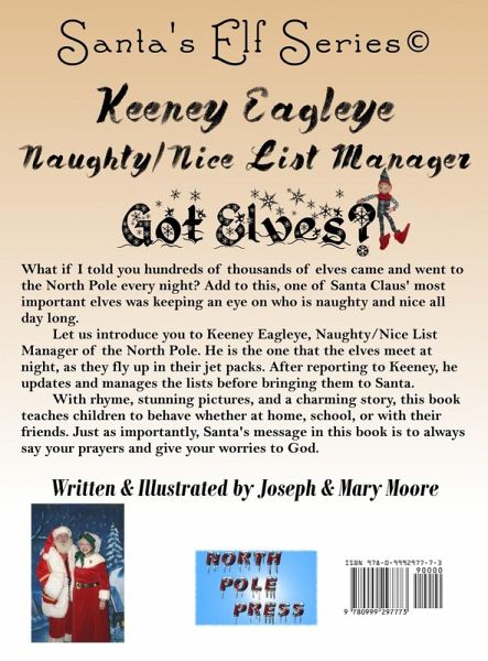 Keeney Eagleye, Naughty/Nice List Manager by Joe Moore is a delightful holiday picture book from the Santa's Elf Series, perfect for children ages 3-8. With rhyming verse and vibrant illustrations by Mary Moore, this story introduces readers to one of Santa's most important elves-Keeney Eagleye, the sharp-eyed manager of the Naughty and Nice Lists. Story Overview Every night, hundreds of elves jet-pack to the North Pole to report their observations to Keeney. He listens carefully, updates the lists, and delivers them to Santa-ensuring that every child's behavior is accounted for. Whether at home, school, or with friends, Keeney's watchful eyes help children remember to be kind, helpful, and honest. Themes & Message The book gently encourages good behavior and includes a heartfelt message from Santa: "Say your prayers and give your worries to God." It's a comforting reminder for children during the busy holiday season and beyond. Series Context Part of a growing collection of elf-themed stories, each book in the Santa's Elf Series highlights a unique helper in Santa's magical world. Keeney's tale blends festive charm with meaningful life lessons, making it a favorite for read-alouds, classroom discussions, and holiday traditions.