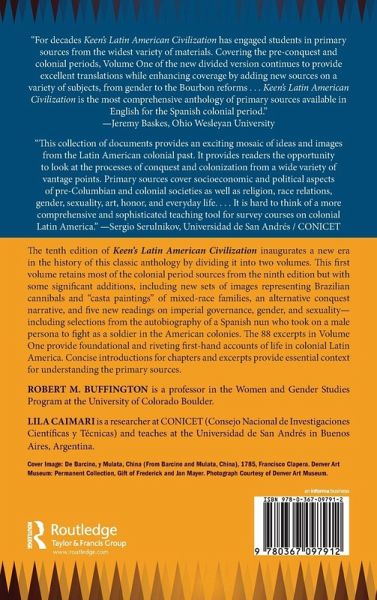 For decades "Keen s Latin American Civilization" has engaged students in primary sources from the widest variety of materials. Covering the pre-conquest and colonial periods, Volume One of the new divided version continues to provide excellent translations while enhancing coverage by adding new sources on a variety of subjects, from gender to the Bourbon reforms . . . "Keen s Latin American Civilization" is the most comprehensive anthology of primary sources available in English for the Spanish colonial period. Jeremy Baskes, Ohio Wesleyan University This collection of documents provides an exciting mosaic of ideas and images from the Latin American colonial past. It provides readers the opportunity to look at the processes of conquest and colonization from a wide variety of vantage points. Primary sources cover socioeconomic and political aspects of pre-Columbian and colonial societies as well as religion, race relations, gender, sexuality, art, honor, and everyday life. . . . It is hard to think of a more comprehensive and sophisticated teaching tool for survey courses on colonial Latin America. Sergio Serulnikov, Universidad de San Andres / CONICET The tenth edition of "Keen s Latin American Civilization" inaugurates a new era in the history of this classic anthology by dividing it into two volumes. This first volume retains most of the colonial period sources from the ninth edition but with some significant additions, including new sets of images representing Brazilian cannibals and casta paintings of mixed race families, an alternative conquest narrative, and five new readings on imperial governance, gender, and sexualityincluding selections from the autobiography of a Spanish nun who took on a male persona to fight as a soldier in the American colonies. The 88 excerpts in Volume One provide foundational and riveting first-hand accounts of life in colonial Latin America. Concise introductions for chapters and excerpts provide essential context for understanding the primary sources. Robert M. Buffington is a professor in the Women and Gender Studies Program at the University of Colorado Boulder. Lila Caimari is a researcher at CONICET (Consejo Nacional de Investigaciones Cientificas y Tecnicas) in Buenos Aires, Argentina. "