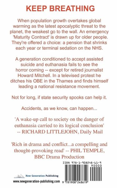 When population growth overtakes global warming as the latest apocalyptic threat to the planet, the weakest go to the wall. Older, 'non-productive' people are offered voluntary terminal sedation on the NHS. You can opt out, of course - in return for a reduced pension. In a high-profile protest, Howard Mitchell ditches his OBE in the Thames and finds himself leading a national resistance movement. But not for long if state security spooks have their way. He has strayed into 'tragic accident' territory... 'A must read. Could this chilling scenario really happen? Take a good look at our dodgy politicians and you'll have the answer' -- RICHARD LITTLEJOHN, Daily Mail