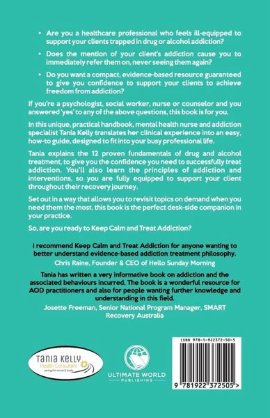 · Are you a healthcare professional who feels ill-equipped to support your clients trapped in drug or alcohol addiction? · Does the mention of your client's addiction cause you to immediately refer them on, never seeing them again? · Do you want a compact, evidence-based resource guaranteed to give you confidence to support your clients to achieve freedom from addiction? If you're a psychologist, social worker, nurse or counselor and you answered 'yes' to any of the above questions, this book is for you. In this unique, practical handbook, mental health nurse and addiction specialist Tania Kelly translates her clinical experience into an easy, how-to guide, designed to fit into your busy professional life. Tania explains the 12 proven fundamentals of drug and alcohol treatment, to give you the confidence you need to successfully treat addiction. You'll also learn the principles of addiction and interventions, so you are fully equipped to support your client throughout their recovery journey. Set out in a way that allows you to revisit topics on demand when you need them the most, this book is the perfect desk-side companion in your practice. So, are you ready to Keep Calm and Treat Addiction? The first step in reducing stigma around alcohol and drug use is normalising conversations about our relationship with these substances. Tania has created a must-read guide for clinicians and service providers to assist in this process, packed full of techniques,strategies and practical guidance on how to work with clients wishing to address their alcohol or drug use. I recommend Keep Calm and Treat Addiction for anyone wanting to better understand evidence-based addiction treatment philosophy. Chris Raine, Founder & CEO of Hello Sunday Morning Tania has written a very informative book on addiction and the associated behaviours incurred. The book is a wonderful resource for AOD practitioners and also for people wanting further knowledge and understanding in this field. It is clearly written, easy to understand and includes good examples throughout. Highly recommended. Josette Freeman, Senior National Program Manager, SMART Recovery Australia