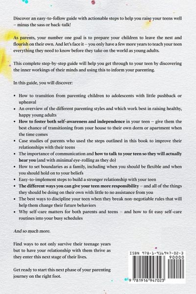 Discover an easy-to-follow guide with actionable steps to help you raise your teens well - minus the sass or back-talk! Are you unsure of how to parent your not-so-little son or daughter now that they've reached their teenage years? Do you ever worry that you are giving them too little or too much independence? Are you unsure of how to discipline your teenager now that timeouts no longer hold the same weight? If you answered 'yes' to any of the above questions, then you have come to the right place. As parents, your number one goal is to prepare your children to leave the nest and flourish on their own. And let's face it - you only have a few more years to teach your teen everything they need to know before they take on the world as young adults. However, in one recent study, 25% of parents admitted they were their teen's main barrier to "launching" and moving out because they did not take the time or effort to give their teens more independence during those crucial teenage years. Don't be a part of this statistic. Discover what you need to know about parenting now for your teen to have success later. This complete step-by-step guide will help you get through to your teen by discovering the inner workings of their minds and using this to inform your parenting. In this guide, you will discover:How to transition from parenting children to adolescents with little pushback or upheaval An overview of the different parenting styles and which work best in raising healthy, happy young adults How to foster both self-awareness and independence in your teen - give them the best chance of transitioning from your house to their own dorm or apartment when the time comes Case studies of parents who used the steps outlined in this book to improve their relationships with their teens The importance of communication and how to talk to your teen so they will actually hear you (and with minimal eye-rolling as they do) How to set boundaries as a family, including when you should be flexible and when you should hold on to your beliefs Easy-to-implement steps to build a stronger relationship with your teen The different ways you can give your teen more responsibility -and all of the things they should be doing on their own with little to no assistance from you The best ways to discipline your teen when they break non-negotiable rules that will help them change their future behaviors Why self-care matters for both parents and teens - and how to fit easy self-care routines into your busy schedules