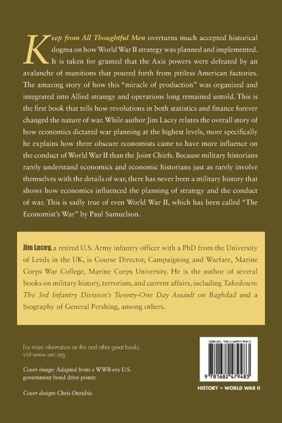 Keep from All Thoughtful Men overturns much accepted historical dogma on how World War II strategy was planned and implemented. It is taken for granted that the Axis powers were defeated by an avalanche of munitions that poured forth from pitiless American factories. The amazing story of how this "miracle of production" was organized and integrated into Allied strategy and operations long remained untold. This is the first book that tells how revolutions in both statistics and finance forever changed the nature of war. While author Jim Lacey relates the overall story of how economics dictated war planning at the highest levels, more specifically he explains how three obscure economists came to have more influence on the conduct of World War II than the Joint Chiefs. Because military historians rarely understand economics and economic historians just as rarely involve themselves with the details of war, there has never been a military history that shows how economics influenced the planning of strategy and the conduct of war. This is sadly true of even World War II, which has been called "The Economist's War" by Paul Samuelson.