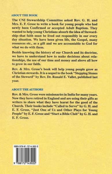 The CNI Stewardship Committee asked Rev. G.H. and Mrs. E.F. Grose to write a book for young people who had newly been confirmed or accepted Adult Baptism. They wanted to help young Christians absorb the idea of Stewardship - that faith must be lived out of responsibility in our everyday situation. We have been given life, the Gospel, many other resources etc., as a gift and we are accountable to God for what we do with them. Besides knowing the history of our Church and its doctrine, we have to understand how to make decisions about relationships, the use of our time and money and above all, how to grow our faith. Rev. & Mrs. Grose's book will help young people grow as Christian stewards. It is a sequel to thr book "Stepping Stones of the Steward" by Rev. Dr. Ronald E. Vallet, published last year.