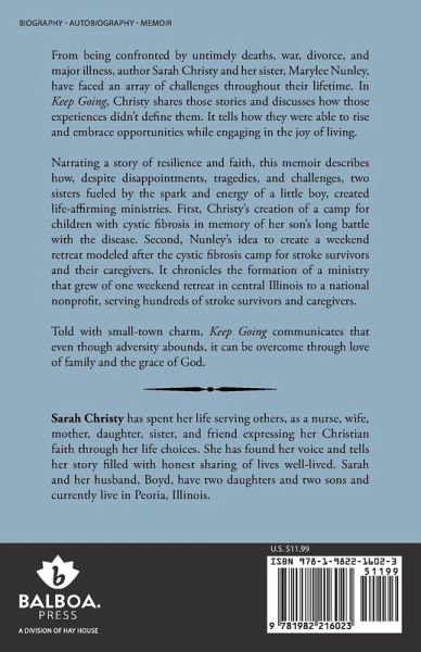 From being confronted by untimely deaths, war, divorce, and major illness, author Sarah Christy and her sister, Marylee Nunley, have faced an array of challenges throughout their lifetime. In Keep Going, Christy shares those stories and discusses how those experiences didn't define them. It tells how they were able to rise and embrace opportunities while engaging in the joy of living. Narrating a story of resilience and faith, this memoir describes how, despite disappointments, tragedies, and challenges, two sisters fueled by the spark and energy of a little boy, created life-affirming ministries. First, Christy's creation of a camp for children with cystic fibrosis in memory of her son's long battle with the disease. Second, Nunley's idea to create a weekend retreat modeled after the cystic fibrosis camp for stroke survivors and their caregivers. It chronicles the formation of a ministry that grew of one weekend retreat in central Illinois to a national nonprofit, serving hundreds of stroke survivors and caregivers. Told with small-town charm, Keep Going communicates that even though adversity abounds, it can be overcome through love of family and the grace of God.