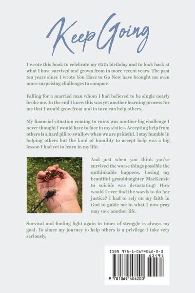 I wrote this book to celebrate my 65th birthday and to look back at what I have survived and grown from in more recent years. The past ten years since I wrote You Have to Go Now have brought me even more surprising challenges to conquer. Falling for a married man whom I had believed to be single nearly broke me. In the end I knew this was yet another learning process for me that I would grow from and in turn can help others. My financial situation coming to ruins was another big challenge I never thought I would have to face in my sixties. Accepting help from others is a hard pill to swallow when we are prideful. I stay humble in helping others but the kind of humility to accept help was a big lesson I had yet to learn in my life. And just when you think you've survived the worse things possible the unthinkable happens. Losing my beautiful granddaughter MacKenzie to suicide was devastating! How would I ever find the words to do her justice? I had to rely on my faith in God to guide me in what I now pray may save another life. Survival and finding light again in times of struggle is always my goal. To share my journey to help others is a privilege I take very seriously.