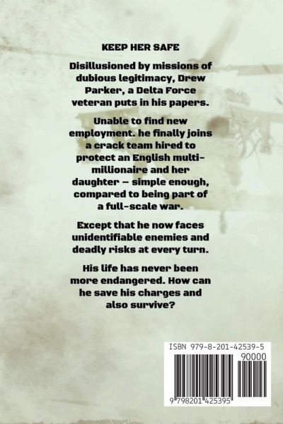 Disillusioned by missions of dubious legitimacy, Drew Parker, a Delta Force veteran puts in his papers. Unable to find new employment. he finally joins a crack team hired to protect an English multi-millionaire and her daughter – simple enough, compared to being part of a full-scale war. Except that he now faces unidentifiable enemies and deadly risks at every turn. His life has never been more endangered. How can he save his charges and still survive?