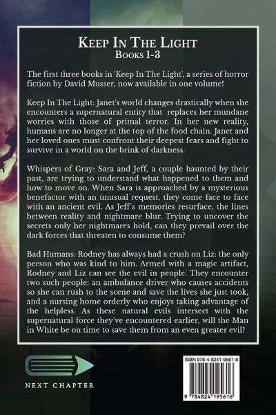 The first three books in 'Keep In The Light', a series of horror fiction by David Musser, now available in one volume! Keep In The Light: Janet's world changes drastically when she encounters a supernatural entity that replaces her mundane worries with those of primal terror. In her new reality, humans are no longer at the top of the food chain. Janet and her loved ones must confront their deepest fears and fight to survive in a world on the brink of darkness. Whispers of Gray: Sara and Jeff, a couple haunted by their past, are trying to understand what happened to them and how to move on. When Sara is approached by a mysterious benefactor with an unusual request, they come face to face with an ancient evil. As Jeff's memories resurface, the lines between reality and nightmare blur. Trying to uncover the secrets only her nightmares hold, can they prevail over the dark forces that threaten to consume them? Bad Humans: Rodney has always had a crush on Liz: the only person who was kind to him. Armed with a magic artifact, Rodney and Liz can see the evil in people. They encounter two such people: an ambulance driver who causes accidents so she can rush to the scene and save the lives she just took, and a nursing home orderly who enjoys taking advantage of the helpless. As these natural evils intersect with the supernatural force they've encountered earlier, will the Man in White be on time to save them from an even greater evil?