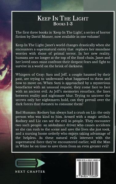 The first three books in 'Keep In The Light', a series of horror fiction by David Musser, now available in one volume! Keep In The Light: Janet's world changes drastically when she encounters a supernatural entity that replaces her mundane worries with those of primal terror. In her new reality, humans are no longer at the top of the food chain. Janet and her loved ones must confront their deepest fears and fight to survive in a world on the brink of darkness. Whispers of Gray: Sara and Jeff, a couple haunted by their past, are trying to understand what happened to them and how to move on. When Sara is approached by a mysterious benefactor with an unusual request, they come face to face with an ancient evil. As Jeff's memories resurface, the lines between reality and nightmare blur. Trying to uncover the secrets only her nightmares hold, can they prevail over the dark forces that threaten to consume them? Bad Humans: Rodney has always had a crush on Liz: the only person who was kind to him. Armed with a magic artifact, Rodney and Liz can see the evil in people. They encounter two such people: an ambulance driver who causes accidents so she can rush to the scene and save the lives she just took, and a nursing home orderly who enjoys taking advantage of the helpless. As these natural evils intersect with the supernatural force they've encountered earlier, will the Man in White be on time to save them from an even greater evil?