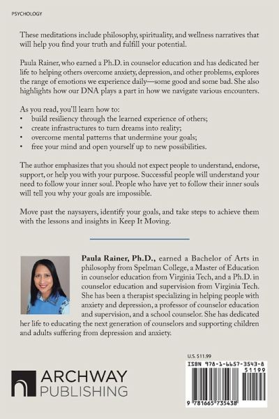 These meditations include philosophy, spirituality, and wellness narratives that will help you find your truth and fulfill your potential. Paula Rainer, who earned a Ph.D. in counselor education and has dedicated her life to helping others overcome anxiety, depression, and other problems, explores the range of emotions we experience daily-some good and some bad. She also highlights how our DNA plays a part in how we navigate various encounters. As you read, you'll learn how to: ¿ build resiliency through the learned experience of others; ¿ create infrastructures to turn dreams into reality; ¿ overcome mental patterns that undermine your goals; ¿ free your mind and open yourself up to new possibilities. The author emphasizes that you should not expect people to understand, endorse, support, or help you with your purpose. Successful people will understand your need to follow your inner soul. People who have yet to follow their inner souls will tell you why your goals are impossible. Move past the naysayers, identify your goals, and take steps to achieve them with the lessons and insights in Keep It Moving.