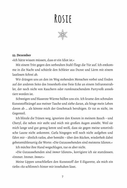 Als Rosies Freund sie kurz vor den Feiertagen sitzen lässt, hat sie endgültig die Nase voll von Männern und Beziehungen. Nach einer durchfeierten Nacht findet sie sich auf einmal in den tröstenden Armen von Nick Horan wieder. Und obwohl der tätowierte Womanizer eigentlich so gar nicht ihr Typ ist, bittet Rosie ihn, sie zur Weihnachtsfeier ihrer Familie zu begleiten. Prompt wird Nick für ihren Freund gehalten und die beiden kommen sich auf dem verschneiten Landsitz von Rosies Familie unweigerlich näher. Aber auch wenn das irische Wicklow seinen ganz eigenen Winterzauber versprüht, so ist doch Rosies Vergangenheit hier präsenter denn je und droht die aufkeimenden Gefühle für Nick unter ihrem Gewicht zu begraben ...