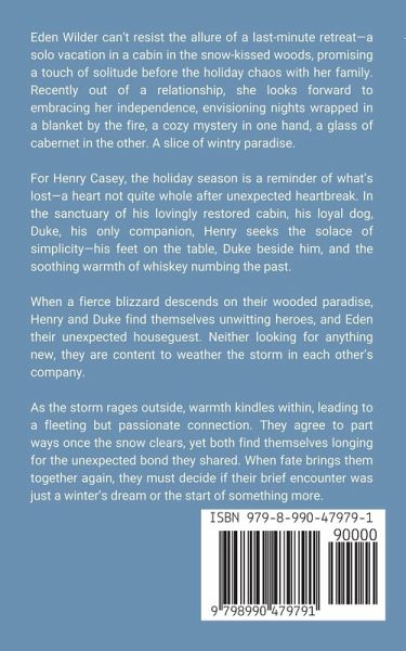 Eden Wilder can't resist the allure of a last-minute retreat-a solo vacation in a cabin in the snow-kissed woods, promising a touch of solitude before the holiday chaos with her family. Recently out of a relationship, she looks forward to embracing her independence, envisioning nights wrapped in a blanket by the fire, a cozy mystery in one hand, a glass of cabernet in the other. A slice of wintry paradise. For Henry Casey, the holiday season is a reminder of what's lost-a heart not quite whole after unexpected heartbreak. In the sanctuary of his lovingly restored cabin, his loyal dog, Duke, his only companion, Henry seeks the solace of simplicity-his feet on the table, Duke beside him, and the soothing warmth of whiskey numbing the past. When a fierce blizzard descends on their wooded paradise, Henry and Duke find themselves unwitting heroes, and Eden their unexpected houseguest. Neither looking for anything new, they are content to weather the storm in each other's company. As the storm rages outside, warmth kindles within, leading to a fleeting but passionate connection. They agree to part ways once the snow clears, yet both find themselves longing for the unexpected bond they shared. When fate brings them together again, they must decide if their brief encounter was just a winter's dream or the start of something more.