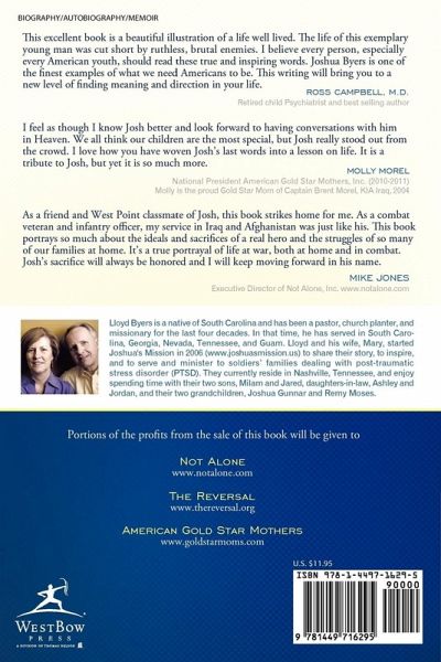 This excellent book is a beautiful illustration of a life well lived. The life of this exemplary young man was cut short by ruthless, brutal enemies. I believe every person, especially every American youth, should read these true and inspiring words. Joshua Byers is one of the finest examples of what we need Americans to be. This writing will bring you to a new level of finding meaning and direction in your life. Ross Campbell, M.D. Retired child Psychiatrist and best selling author. I feel as though I know Josh better and look forward to having conversations with him in Heaven. We all think our children are the most special, but Josh really stood out from the crowd. I love how you have woven Josh's last words into a lesson on life. It is a tribute to Josh, but yet it is so much more. Molly Morel National President American Gold Star Mothers, Inc. (2010-2011) Molly is the proud Gold Star Mom of Captain Brent Morel, KIA Iraq, 2004. As a friend and West Point classmate of Josh, this book strikes home for me. As a combat veteran and infantry officer, my service in Iraq and Afghanistan was just like his. This book portrays so much about the ideals and sacrifices of a real hero and the struggles of so many of our families at home. It's a true portrayal of life at war, both at home and in combat. Josh's sacrifice will always be honored and I will keep moving forward in his name. Mike Jones Executive Director of Not Alone, Inc. www.notalone.com