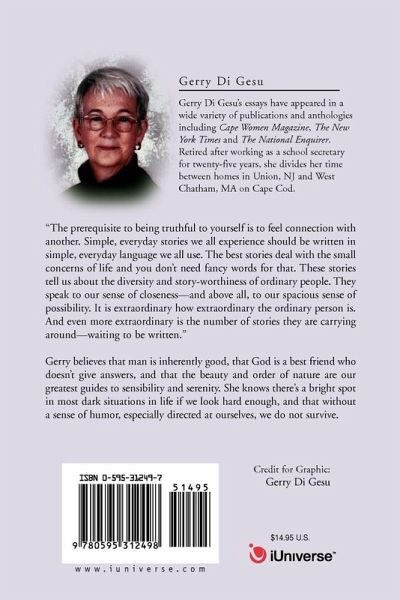 "The prerequisite to being truthful to yourself is to feel connection with another. Simple, everyday stories we all experience should be written in simple, everyday language we all use. The best stories deal with the small concerns of life and you don't need fancy words for that. These stories tell us about the diversity and story-worthiness of ordinary people. They speak to our sense of closeness--and above all, to our spacious sense of possibility. It is extraordinary how extraordinary the ordinary person is. And even more extraordinary is the number of stories they are carrying around--waiting to be written." Gerry Di Gesu believes that man is inherently good, that God is a best friend who doesn't give answers, and that the beauty and order of nature are our greatest guides to sensibility and serenity. She knows there's a bright spot in most dark situations in life if we look hard enough, and that without a sense of humor, especially directed at ourselves, we do not survive.
