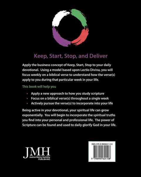 Keep, Start, Stop, and Deliver Apply the business concept of Keep, Start, Stop to your daily devotional. Using a model based upon Lectio Divina, you will focus weekly on a biblical verse to understand how the verse(s) apply to you during that particular week in your life. This book will help youApply a new approach to how you study scripture Focus on a biblical verse(s) throughout a single week Actively pursue the verse(s) to incorporate into your life Being active in your devotional, your spiritual life can grow exponentially. You will begin to incorporate the spiritual truths you find into your personal and professional life. The power of Scripture can be found and used to daily glorify God in your life.
