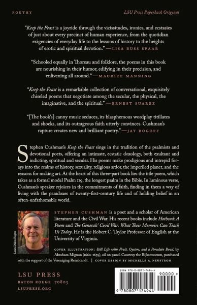 Stephen Cushman's Keep the Feast sings in the tradition of the psalmists and devotional poets, offering an intimate, ecstatic doxology, both exultant and indicting, spiritual and secular. His poems make prodigious and intrepid forays into the realms of history, sexuality, religious ardor, the imperiled planet, and the reasons for making art. At the heart of this three-part book lies the title poem, which takes as a formal model Psalm 119, the longest psalm in the Bible. In luminous verse, Cushman's speaker rejoices in the commitments of faith, finding in them a way of living with the paradoxes of twenty-first-century life and of holding belief in an often-unfathomable world.