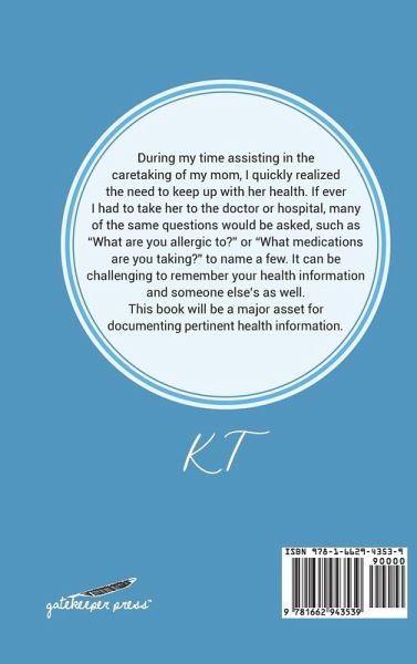 Book Description: Not given Author Bio: During my time assisting in the caretaking of my mom, I quickly realized the need to keep up with her health. If ever I had to take her to the doctor or hospital, many of the same questions would be asked, such as "What are you allergic to?" or "What medications are you taking?" to name a few. It can be challenging to remember your health information and someone else's as well. This book will be a major asset for documenting pertinent health information.