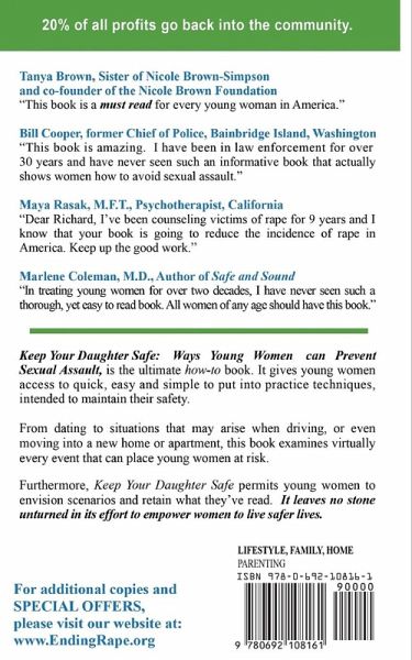 EXTREEEEMLY comprehensive, yet easy to read book on women's safety. 3rd Printing updated with new information and tips.. Keep Your Daughter Safe is an award winning book that was written for girls between the ages of 12 and 22 - - the age group most dramatically impacted by rape and sexual assault. Very easy to slip into a backpack or purse and the girls ACTUALLY READ THE BOOK!! Thank you.