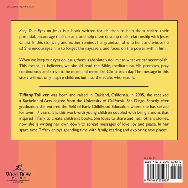 Keep Your Eyes on Jesus is a book written for children to help them realize their potential, encourage their dreams and help them develop their relationship with Jesus Christ. In this story, a grandmother reminds her grandson of who he is and whose he is! She encourages him to forget the naysayers and focus on the power within him. When we keep our eyes on Jesus, there is absolutely no limit to what we can accomplish! This means, as believers, we should read the Bible, meditate on His promises, pray continuously and strive to be more and more like Christ each day. The message in this story will not only inspire children, but also the adults who read it.