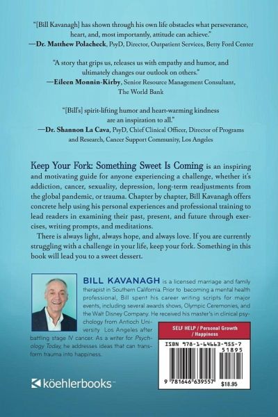 Keep Your Fork: Something Sweet Is Coming is an inspiring and motivating guide for anyone experiencing a challenge, whether it's addiction, cancer, sexuality, depression, long-term readjustments from the global pandemic, or trauma. Chapter by chapter, Bill Kavanagh offers concrete help using his personal experiences and professional training to lead readers in examining their past, present, and future through exercises, writing prompts, and meditations.There is always light, always hope, and always love. If you are currently struggling with a challenge in your life, keep your fork. Something in this book will lead you to a sweet dessert.