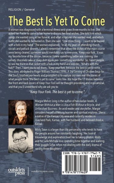 A woman was diagnosed with a terminal illness and given three months to live. She asked her Pastor to come to her home to discuss her final wishes. She told him which songs she wanted sung at her funeral, and what scriptures she wanted read, and which outfit she wanted to be buried in. Then she said, "One more thing... I want to be buried with a fork in my hand." The woman explained, "In all my years of attending church socials and potluck dinners, I always remember that when the dishes of the main course were being cleared, someone would inevitably say to everyone, 'Keep your fork.' It was my favorite time of the dinner, because I knew something better was coming, like velvety chocolate cake or deep dish apple pie- something wonderful. So, I want people to see me there in that casket with a fork in my hand and wonder, "What's with the fork?" Then, I want you to tell them, "Keep your fork, because the best is yet to come." This story, attributed to Roger William Thomas (1996, A 3rd Serving of Chicken Soup for the Soul), touched our hearts and prompted us to capture our own real-life stories of what people think "the best is yet to come" looks like. We hope the 17 stories between the front and back covers of Keep Your Fork will be thought-provoking and inspirational, and that you'll understand why we ask you to: "Keep Your Fork. The best is yet to come."