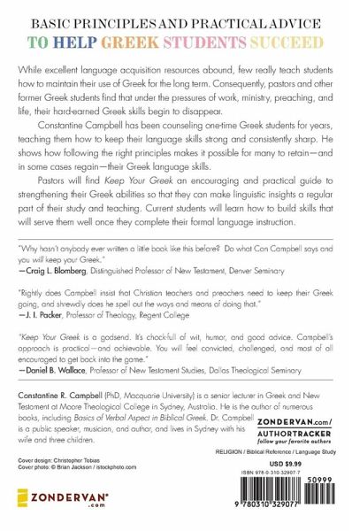 Seminarians spend countless hours mastering biblical languages and learning how the knowledge of them illuminates the reading, understanding, and application of Scripture. But while excellent language acquisition resources abound, few really teach students how to maintain their use of Greek for the long term. Consequently, pastors and other former Greek students find that under the pressures of work, ministry, preaching, and life, their hard-earned Greek skills begins to disappear. Con Campbell has been counseling one-time Greek students for years, teaching them how to keep their language facility for the benefit of those to whom they minister and teach. He shows how following the right principles makes it possible for many to retain---and in some cases regain---their Greek language skills. Pastors will find Keep Your Greek an encouraging and practical guide to strengthening their Greek abilities so that they can make linguistic insights a regular part of their study and teaching. Current students will learn how to build skills that will serve them well once they complete their formal language instruction.