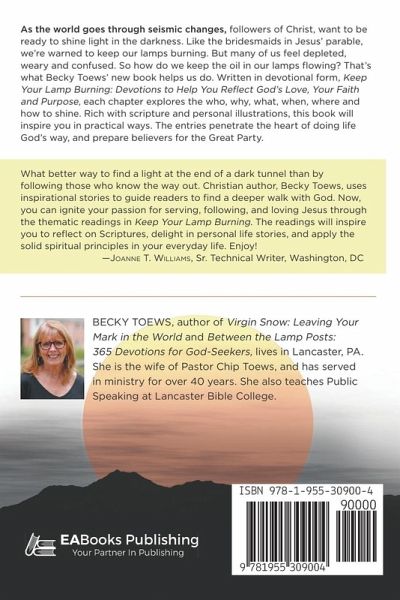 As the world goes through seismic changes, followers of Christ, want to be ready to shine light in the darkness. Like the bridesmaids in Jesus' parable, we're warned to keep our lamps burning. But many of us feel depleted, weary and confused. So how do we keep the oil in our lamps flowing? That's what Becky Toews' new book helps us do. Written in devotional form, Keep Your Lamp Burning: Devotions to Help You Reflect God's Love, Your Faith and Purpose, each chapter explores the who, why, what, when, where and how to shine. Rich with scripture and personal illustrations, this book will inspire you in practical ways. The entries penetrate the heart of doing life God's way, and prepare believers for the Great Party.