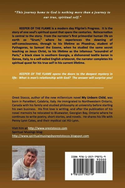KEEPER OF THE FLAME is a modern day Pilgrim's Progress. It is the story of one soul's spiritual quest that spans the centuries. Reincarnation is central to the story. From the narrator's first primordial human life on earth as "Grunt," where he experiences the dawning of self-consciousness, through to his lifetime as Phaedrus, student of Pythagoras, to Samuel the Essene, when he studied the same secret teaching as Jesus Christ, to his lifetime as the infamous "scoundrel of Paris," a black slave in southern Georgia, a dishonored textile baron in Genoa, Italy, to a self-exiled English aristocrat, the narrator completes his spiritual quest for his true self in his current lifetime. KEEPER OF THE FLAME opens the doors to the deepest mystery in life: What is man's relationship with God? The answer will surprise you!