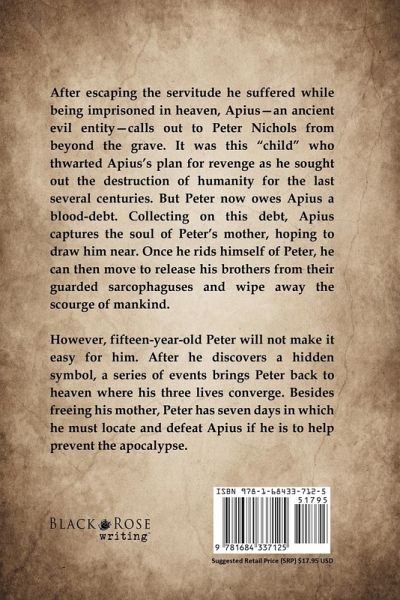 After escaping the servitude he suffered while being imprisoned in heaven, Apius-an ancient evil entity-calls out to Peter Nichols from beyond the grave. It was this "child" who thwarted Apius's plan for revenge as he sought out the destruction of humanity for the last several centuries. But Peter now owes Apius a blood-debt. Collecting on this debt, Apius captures the soul of Peter's mother, hoping to draw him near. Once he rids himself of Peter, he can then move to release his brothers from their guarded sarcophaguses and wipe away the scourge of mankind. However, fifteen-year-old Peter will not make it easy for him. After he discovers a hidden symbol, a series of events brings Peter back to heaven where his three lives converge. Besides freeing his mother, Peter has seven days in which he must locate and defeat Apius if he is to help prevent the apocalypse.