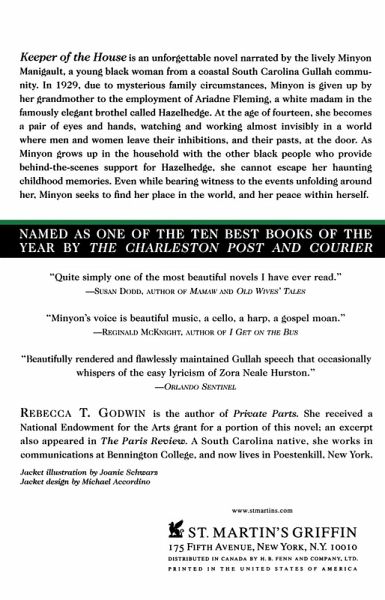 Keeper of the House is Rebecca T. Godwin's unforgettable novel narrated by the lively Minyon Manigault, a young black woman from a coastal South Carolina Gullah community. In 1929, due to mysterious family circumstances, Minyon is given up by her grandmother to the employment of Ariadne Fleming, a white madam in the famously elegant brothel called Hazelhedge. At the age of fourteen, she becomes a pair of eyes and hands, watching and working almost invisibly in a world where men and women leave their inhibition, and their pasts, at the door. As Minyon grows up in the household with other black people who provide behind-the-scenes support of Hazelhedge, she cannot escape her haunting childhood memories. Even while bearing witness to the events unfolding around her, Minyon seeks to find her place in the world, and her pace within herself.