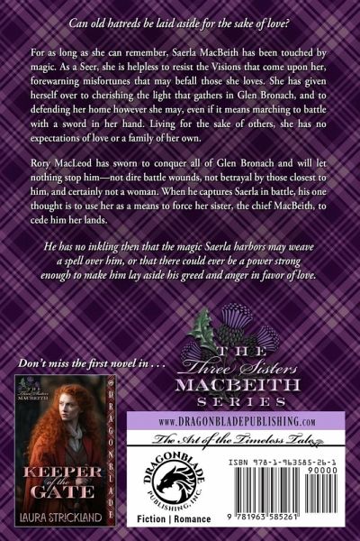 Can old hatreds be laid aside for the sake of love? For as long as she can remember, Saerla MacBeith has been touched by magic. As a Seer, she is helpless to resist the Visions that come upon her, forewarning misfortunes that may befall those she loves. She has given herself over to cherishing the light that gathers in Glen Bronach, and to defending her home however she may, even if it means marching to battle with a sword in her hand. Living for the sake of others, she has no expectations of love or a family of her own. Rory MacLeod has sworn to conquer all of Glen Bronach and will let nothing stop him-not dire battle wounds, not betrayal by those closest to him, and certainly not a woman. When he captures Saerla in battle, his one thought is to use her as a means to force her sister, the chief MacBeith, to cede him her lands. He has no inkling then that the magic Saerla harbors may weave a spell over him, or that there could ever be a power strong enough to make him lay aside his greed and anger in favor of love. The Three Sisters MacBeith Keeper of the Gate Keeper of the Hearth Keeper of the Light