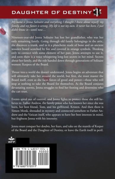 My name is Jenna Solitaire and everything I thought I knew about myself, my family, and my future is wrong. My life is not my own. It never has been. I just didn't know it-until now... Nineteen-year-old Jenna Solitaire has lost her grandfather, who was her only remaining family. Going through old family belongings in the attic, she discovers a trunk, and in it a planchette made of bone and an ancient wooden board scorched by fire and covered in strange symbols. Thinking only to connect with some element of her past, Jenna attempts to use it, and soon there is a voice whispering long-lost secrets in her mind. Secrets about her family, and the role handed down through generations of Solitaire women: Keeper of the Board. Thrust into a world she doesn't understand, Jenna will begin an adventure that will ultimately take her around the world, but first, she must master the Board itself, even as she faces forces of greed and power - those who will stop at nothing to take the Board for themselves. As the Board conjures devastating storms, Jenna struggles to find her footing and determine who she can trust. Events spiral out of control, and Jenna fights to protect those she still believes in: Father Andrew, the family priest who has known her since she was born, her best friend, Tom, and his girlfriend, Kristen. And then there is Simon Monk, shrouded in mystery and connected somehow to Father Andrew and the Vatican itself, who appears to have her best interests in mind, but frightens Jenna with his intensity. Jenna must conquer her doubts, her fears, and take on the mantle of Keeper of the Board and the Daughter of Destiny, or leave the Earth itself in peril.