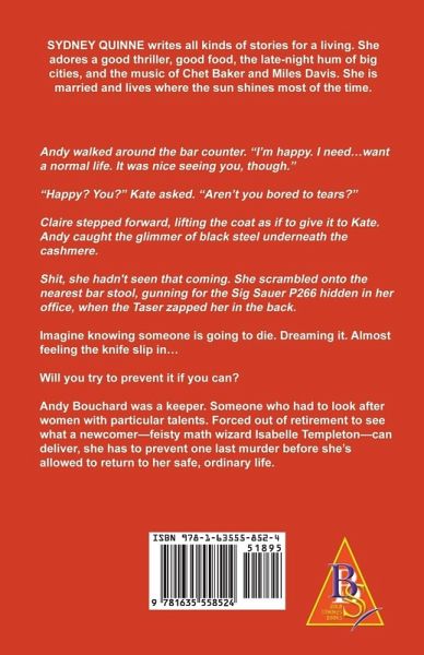 Andy walked around the bar counter. "I'm happy. I need...want a normal life. It was nice seeing you, though." "Happy? You?" Kate asked. "Aren't you bored to tears?" Claire stepped forward, lifting the coat as if to give it to Kate. Andy caught the glimmer of black steel underneath the cashmere. Shit, she hadn't seen that coming. She scrambled onto the nearest bar stool, gunning for the Sig Sauer P266 hidden in her office, when the Taser zapped her in the back. Imagine knowing someone is going to die. Dreaming it. Almost feeling the knife slip in... Will you try to prevent it if you can? Andy Bouchard was a keeper. Someone who had to look after women with particular talents. Forced out of retirement to see what a newcomer--feisty math wizard Isabelle Templeton--can deliver, she has to prevent one last murder before she's allowed to return to her safe, ordinary life.
