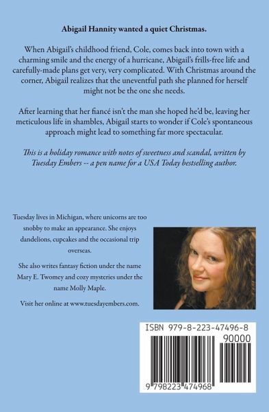Abigail Hannity wanted a quiet Christmas. When Abigail's childhood friend, Cole, comes back into town with a charming smile and the energy of a hurricane, Abigail's frills-free life and carefully-made plans get very, very complicated. With Christmas around the corner, Abigail realizes that the uneventful path she planned for herself might not be the one she needs. After learning that her fiancé isn't the man she hoped he'd be, leaving her meticulous life in shambles, Abigail starts to wonder if Cole's spontaneous approach might lead to something far more spectacular. This is a holiday romance with notes of sweetness and scandal, written by Tuesday Embers -- a pen name for a USA Today bestselling author.