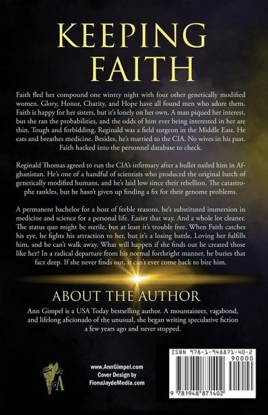 Faith fled her compound one wintry night with four other genetically modified women. Glory, Honor, Charity, and Hope have all found men who adore them. Faith is happy for her sisters, but it’s lonely on her own. A man piqued her interest, but she ran the probabilities, and the odds of him ever being interested in her are thin. Tough and forbidding, Reginald was a field surgeon in the Middle East. He eats and breathes medicine. Besides, he’s married to the CIA. No wives in his past. Faith hacked into the personnel database to check. Reginald Thomas agreed to run the CIA’s infirmary after a bullet nailed him in Afghanistan. He’s one of a handful of scientists who produced the original batches of genetically modified humans, and he’s laid low since their rebellion. The catastrophe rankles, but he hasn’t given up finding a fix for their genome problems. A permanent bachelor for a host of feeble reasons, he’s substituted immersion in medicine and science for a personal life. Easier that way. And a whole lot cleaner. The status quo might be sterile, but at least it’s trouble free. When Faith catches his eye, he fights his attraction to her, but it’s a losing battle. Loving her fulfills him, and he can’t walk away. What will happen if she discovers he helped create those like her? In a radical departure from his normal forthright manner, he buries that fact deep. If she never finds out, it can’t ever come back to bite him.