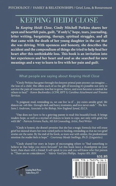 In Keeping Heidi Close, Cindy Perkins shares her open and heartfelt pain, guilt, "if only's," hope, tears, journaling, letter writing, bargaining, therapy, spiritual struggles, and all that came with the death of her young daughter in the car that she was driving. With openness and honesty, she describes the accident and the compendium of things she tried to help heal her heart after this unthinkable loss. She shares watching her young son struggle with the profound loss of his big sister and, later, his survivor guilt as he became the "older brother," many years older than she ever got to be. Her perspective today to say "Yes, I am here, in my life!" speaks through the pages of this book. Yes, the pain is still in her heart. She has moved from those early days of not wanting to open her eyes to her new reality. She has learned how to hold her hurting soul and has gone on to have a wonderful, fulfilling life. She has changed and grown because of the loss of Heidi and the experiences that she was forced to have. She would change every bit of that to have Heidi back, but that is not to be. There is no road map. She is not in any way saying she knows the answers. She does not. She is reaching out to grieving parents and others experiencing profound loss so that, maybe, they might grab hold of something in her journey that gives them a piece of hope to grow from. This book is an invitation into her experiences and her heart and soul as she searched for new meanings and a way to learn to live with her pain and guilt.