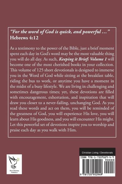 For the word of God is quick, and powerful ... As a testimony to the power of the Bible, just a brief moment spent each day in God's word may be the most valuable thing you will do all day. As such, Keeping it Brief: Volume 1 will become one of the most cherished books in your collection. This volume of 125 short devotionals is designed to immerse you in the Word of God while sitting at the breakfast table, riding the bus to work, or anytime you have a moment in the midst of a busy lifestyle. We are living in challenging and sometimes dangerous times; yet, these devotions are filled with encouragement, exhortation, and inspiration that will draw you closer to a never-failing, unchanging God. As you read these words and act on them, you will be reminded of the greatness of God, you will experience His love, you will learn about His goodness, and you will encounter His might. Let this powerful set of devotions inspire you to worship and praise each day as you walk with Him.