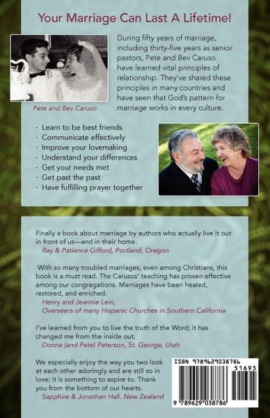 After fifty years of marriage and thirty-five years as pastors of two churches, Pete and Bev Caruso have much to share about marriage. The Carusos have taught on Marriage and Family Living in many diverse cultures of Europe, Africa, North America, Asia and the Pacific Region. In Keeping It Fresh - A Love that Keeps on Growing, they share these same biblically based principles. Through stories and living examples combined with humor and transparency they cover: Friendship within Marriage; Differences by God's Design; Meeting Each Other's Needs; Sex: God's Gift to Marriage; Intentional Communication; Getting Past the Past; Deciding Whom to Marry; and far more. ------------ "Finally a book about marriage by authors who actually live it out in front of us." Patience & Ray Gifford. Portland, Oregon ------------ "We've seen these teachings in person and know that this book will be a lifeline for some marriages." Daniel and Mary Lowery, PA-C. ------------ "With so many marriages, even among Christians, this book is a must read. The Carusos' teaching has proven effective among our congregations." Henry and Jeannie Lein, Overseers of many Hispanic Churches in Southern California ------------ "We've taken many valuable lessons away from your teaching including your example of how a husband and wife should honor one another. We learned to value God, our marriage, and each other. You taught us how to praise each other daily. This is something that was foreign to me growing up. We learned that we have a choice to make our marriage work and to stay in love! We especially enjoy the way you two look at each other adoringly and are still so in love; it is something to aspire to. Thank you from the bottom of our hearts." Jonathan and Sapphire Hall, Mangere, New Zealand ------------ "Pete and Bev have touched our lives deeply during the 45 years we've known them. By observing their lives we have learned how to relate to each other as husband and wife. Their biblical teaching has helped us to grow in many additional areas of our lives. These people are real!" Bill and Joyce Dunn, San Jose, California ------------ "My life has been changed by the Carusos' teaching on marriage. When I began to apply what they teach to my own marriage, I saw how living the truth of the Word actually changed me from the inside out. I've known them for thirty years and can honestly say they live what they teach." Donna (and Pete) Peterson, Canyon Country, California ------------ "We have personally been touched by Bev and Pete's wisdom and knowledge through the way they make scripture relevant to our marriage. They have helped us form a strong foundation for our relationship and we strongly recommend their teachings for people wanting a fulfilling and enriched marriage." Bryan and Leilani Liew, Auckland, New Zealand