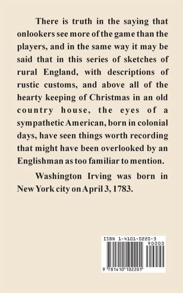 There is truth in the saying that onlookers see more of the game than the players, and in the same way it may be said that in this series of sketches of rural England, with descriptions of rustic customs, and above all of the hearty keeping of Christmas in an old country house, the eyes of a sympathetic American, born in colonial days, have seen things worth recording that might have been overlooked by an Englishman as too familiar to mention. Washington Irving was born in New York city on April 3, 1783.