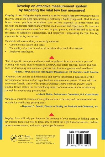 In Keeping Score, the author contends that metrics must be all-encompassing. They must focus not just on the present, but need to consider the past and future. They also must consider the needs of all participants, including customers, shareholders, and employees. Still one must know exactly what to measure, as measuring everything can be more damaging than measuring nothing. Taking a balanced Baldrige approach, this book shows how to evaluate current approaches to measurement and pinpoint false measurements. It covers the selection of financial metrics, ways to measure employee and customer satisfaction, and methods to track performance and measure quality.