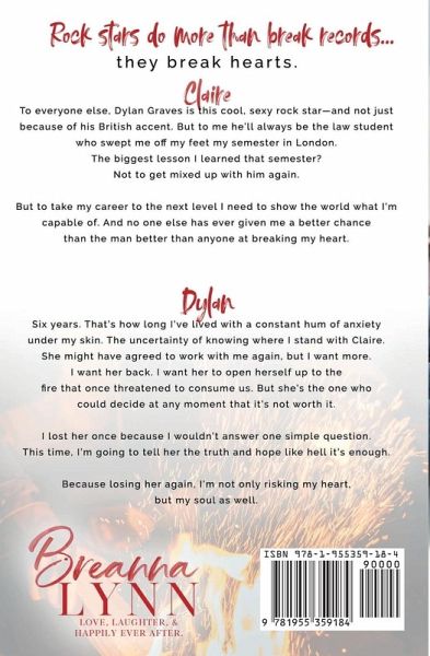 Rock stars do more than break records...they break hearts. Claire To everyone else, Dylan Graves is this cool, sexy rock star-and not just because of his British accent. But to me he'll always be the law student who swept me off my feet my semester in London. The biggest lesson I learned that semester? Not to get mixed up with him again. But to take my career to the next level I need to show the world what I'm capable of. And no one else has given me a better chance than the man better than anyone at breaking my heart. Dylan Six years. That's how long I've lived with a constant hum of anxiety under my skin. The uncertainty of knowing where I stand with Claire. She might have agreed to work with me again, but I want more. I want her to open herself up to the fire that once threatened to consume us. But she's the one who could decide at any moment that it's not worth it. I lost her once because I couldn't answer one simple question. This time I'm going to tell her the truth and hope like hell it's enough. Because losing her again, I'm not only risking my heart, but my soul as well.