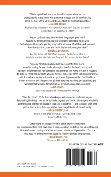 How to attract, retain, and get the most from Generation Y employees A growing problem for many of today's businesses is the high turnover rate of Generation Y employees, also known as Millennials. In Keeping the Millennials, doctors Sujansky and Ferri-Reed explore the reasons for this situation and what can be done about it. They explain how and why companies are losing money due to high turnover, how to create a Millennial-friendly work environment, and how to fix the problem with effective long-term solutions. Readers will also discover what the most common complaints are between generations, the mistakes that companies make that brand them as bad places for young workers, the top attributes of "cool" companies, and more. This is an eye-opening guide to building a great workforce that includes and welcomes today's Millennial workers. Dr. Joanne G. Sujansky, CSP (Pittsburgh, PA) is the founder and CEO of KEYGroup, an international speaking, training, executive coaching, and assessment firm. She is a former National President of the American Society for Training and Development (ASTD), and an active member of the National Speakers Association (NSA). Dr. Jan Ferri-Reed (Pittsburgh, PA) is a seasoned consultant and President of KEYGroup.