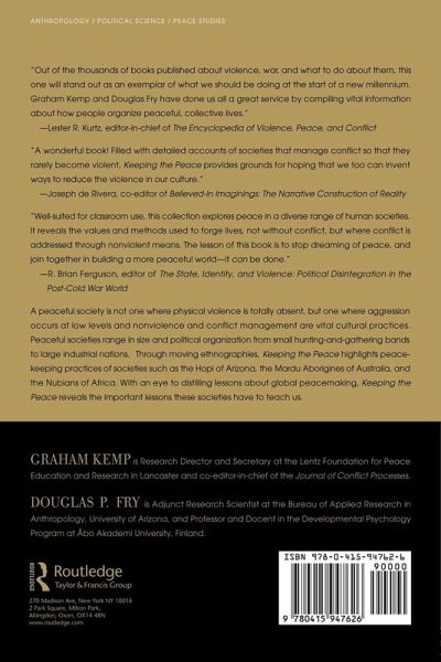 Chapter 1 The Concept of Peaceful Societies Graham Kemp; Chapter 2 A Positive Concept of Peace Ximena Davies-Vengoechea; Chapter 3 Contentious But Not Violent: The Hopi of Northern Arizona Alice Schlegel; Chapter 4 Restraint and Ritual Apology: The Rotumans of the South Pacific Alan Howard; Chapter 5 Respect for All: The Paliyans of South India Peter M. Gardner; Chapter 6 Multiple Paths to Peace: The "La Paz" Zapotec of Mexico Douglas P. Fry; Chapter 7 Resolving Conflict Within the Law: The Mardu Aborigines of Australia Robert Tonkinson; Chapter 8 Putting a Stone in the Middle: The Nubians of Northern Africa Robert Fernea; Chapter 9 Keeping the Peace in an Island World: The Sama Dilaut of Southeast Asia CLifford Sather; Chapter 10 A Model of Peacefulness: Rethinking Peace and Conflictin Norway Kristin Dobinson; Chapter 11 Cautious Alert Polite and Elusive: The Semai of Central Peninsular Malaysia Robert Knox Dentan; Chapter 12 Conclusion: Learning from Peaceful Societies Douglas P. Fry;